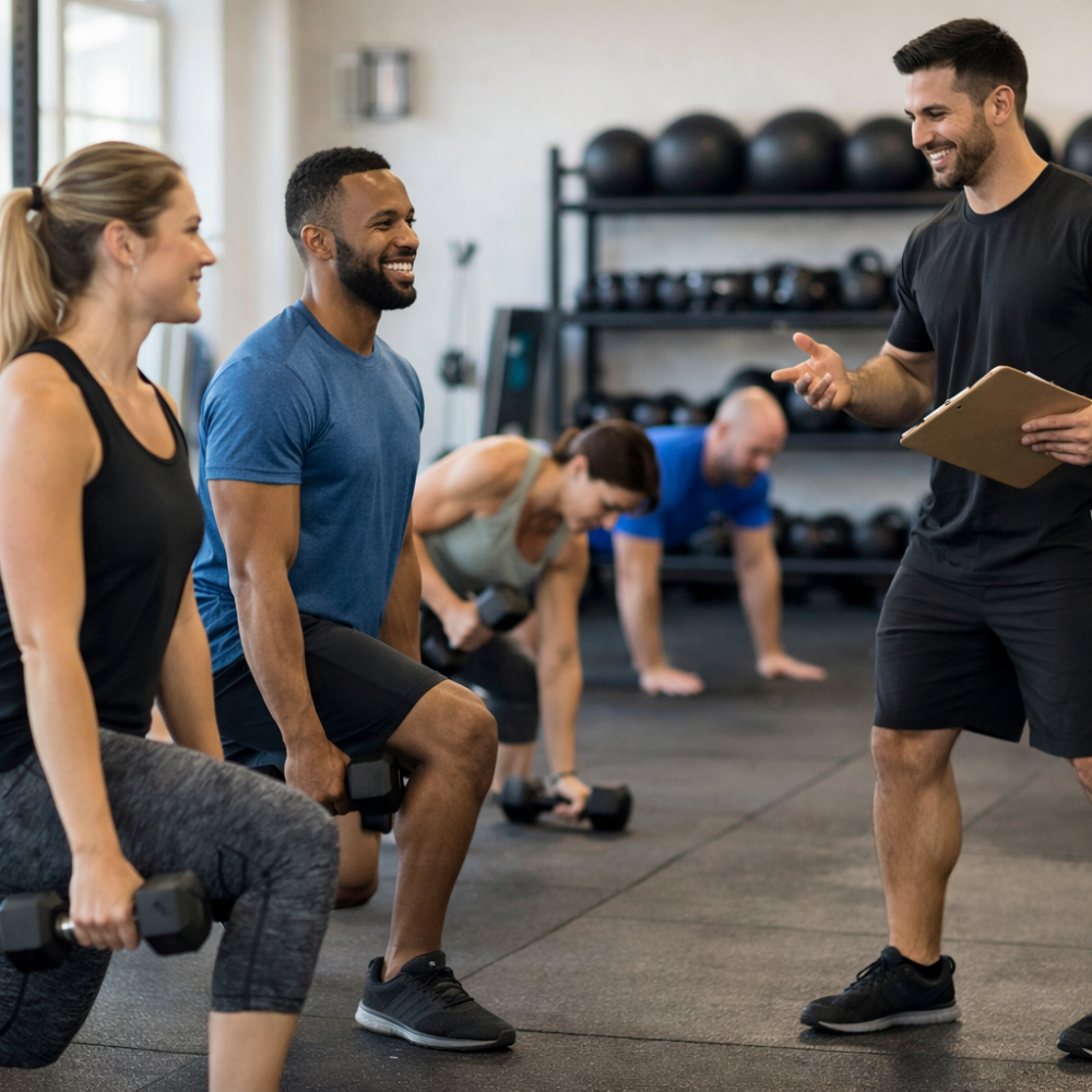 Building lean muscle improves metabolism, supports fat loss, and enhances daily function. Squats, presses, rows, and core work are essential movements that create full-body progress.